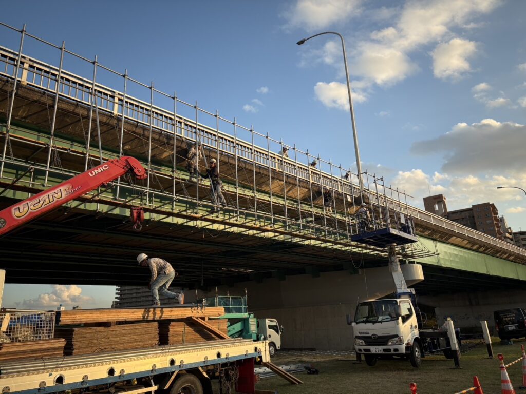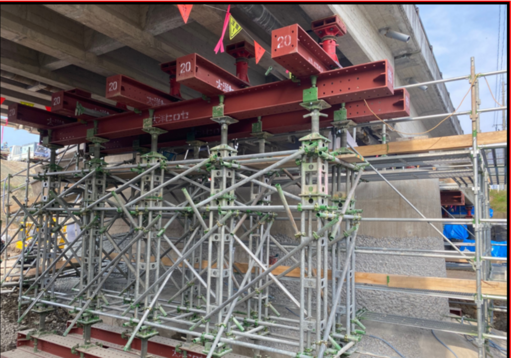 弊社で組み立てした足場を使用して、橋梁補修工事の類も施工致します。沓座取り換え